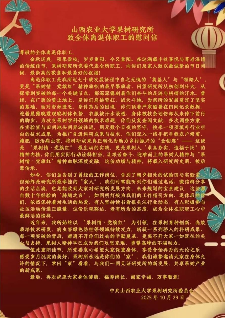 金秋送爽,硕果盈枝;岁岁重阳,今又重阳。9月30日至10月29日,果树研究所围绕“尊老爱老,融洽和谐”主题,开展重阳节系列活动,向离退休职工传递所党委与全体职工的敬意与问候,营造了热烈温馨的节日氛围。