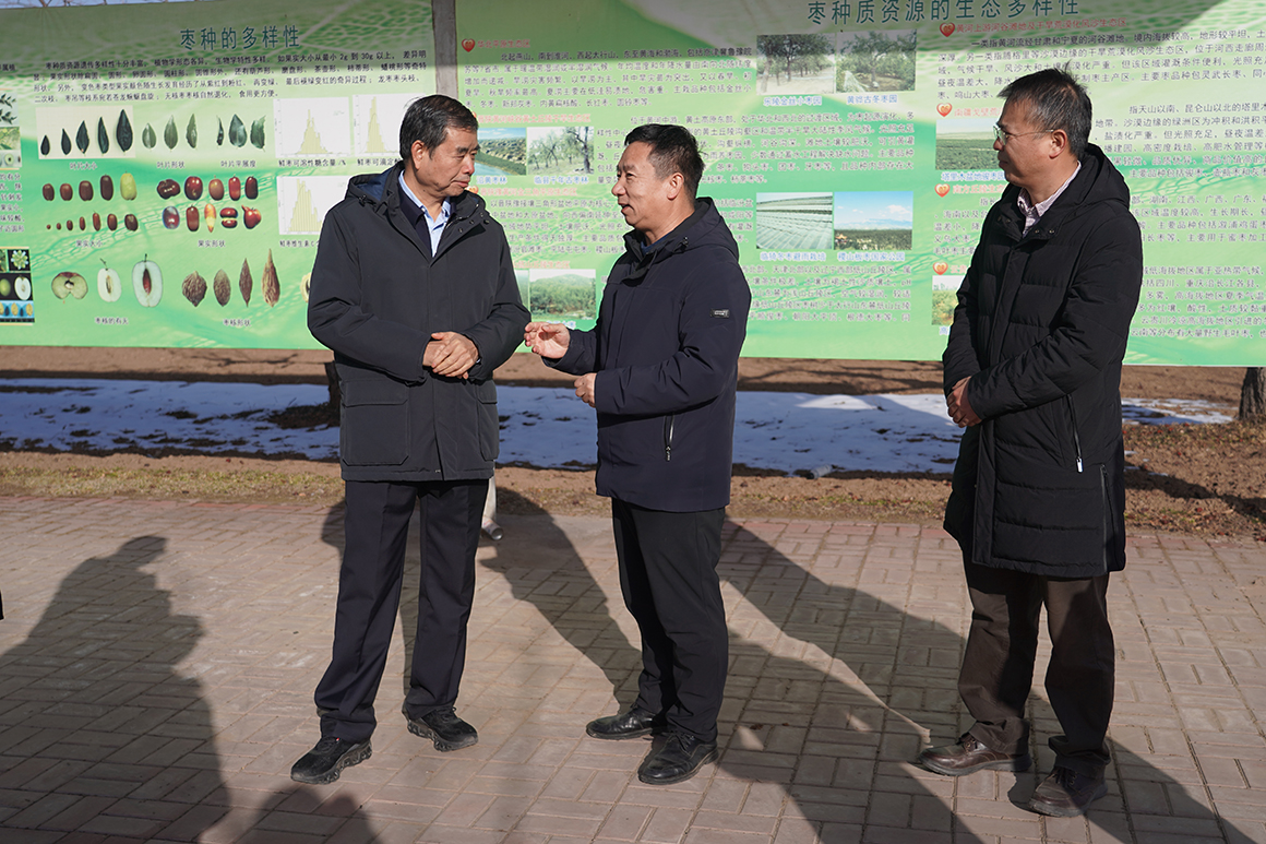 徐院士一行首先来到果树旱作栽培与生理试验示范园,杨凯详细汇报了近年来,团队在果树有机旱作栽培方面的研发重点、取得成效及未来工作计划。在国家枣种质资源圃,赵旗峰所长向徐院士介绍了资源圃的建设历程,“一岗一站”支撑产业发展的情况及当前存在的问题等。随后,还调研了国家葡萄产业技术体系太谷试验站、国家梨产业技术体系太谷试验站,相关人员就试验站建设、运行情况进行了汇报。